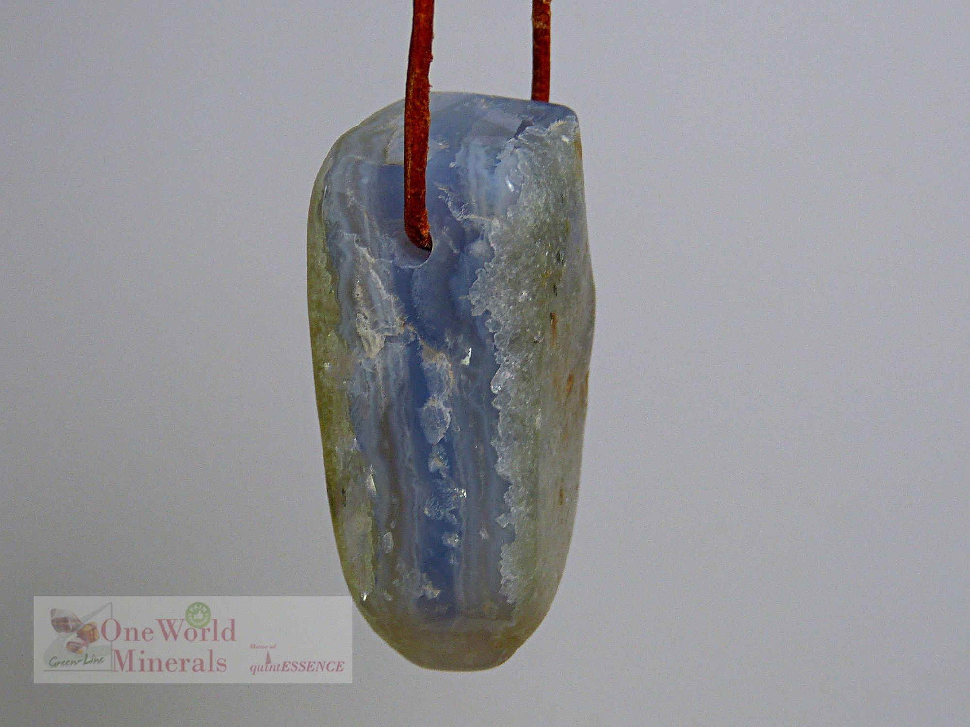 Der Anhänger kann beidseitig getragen werden. Die Herkunft dieses Chalcedon ist Namibia.