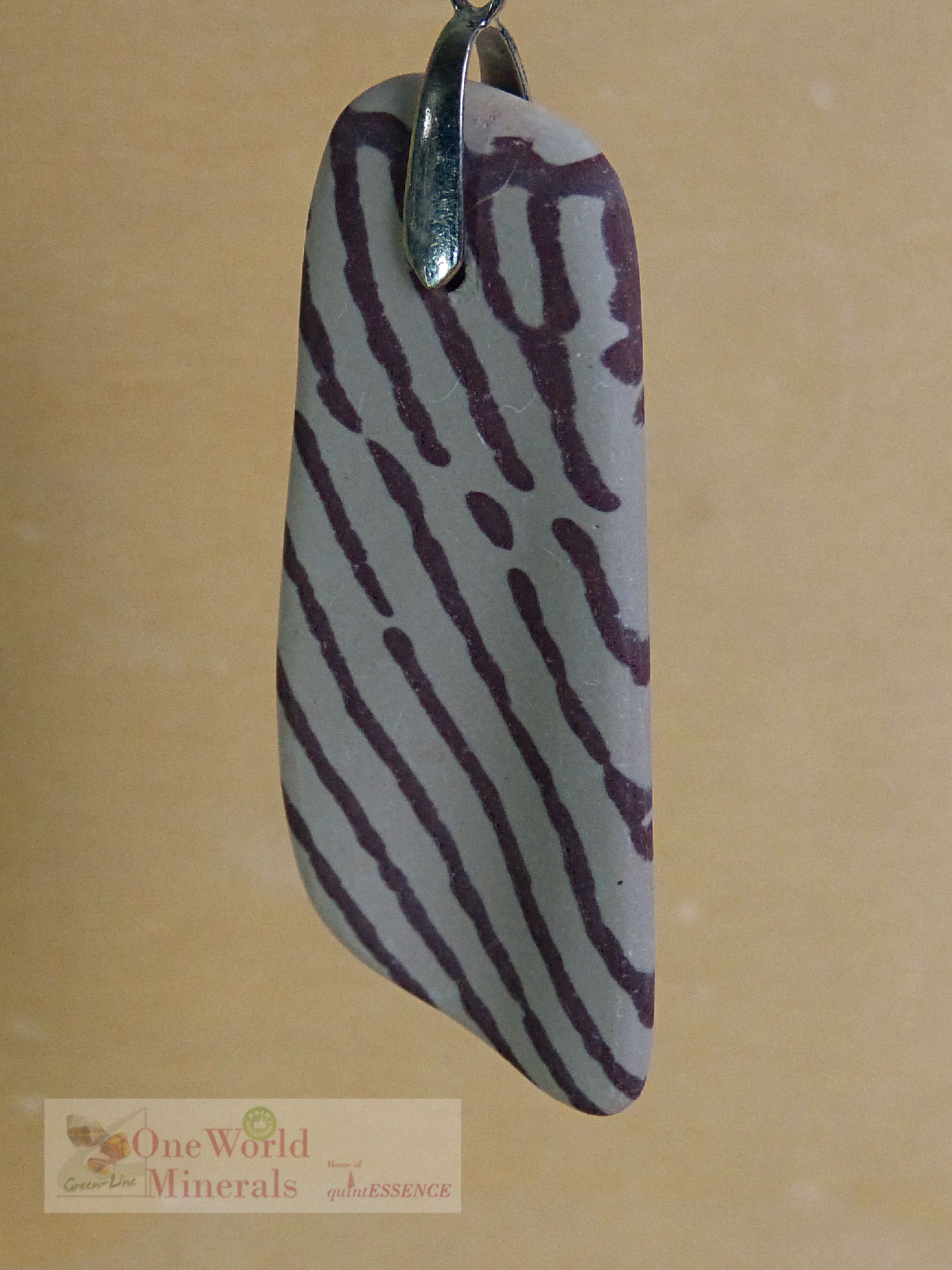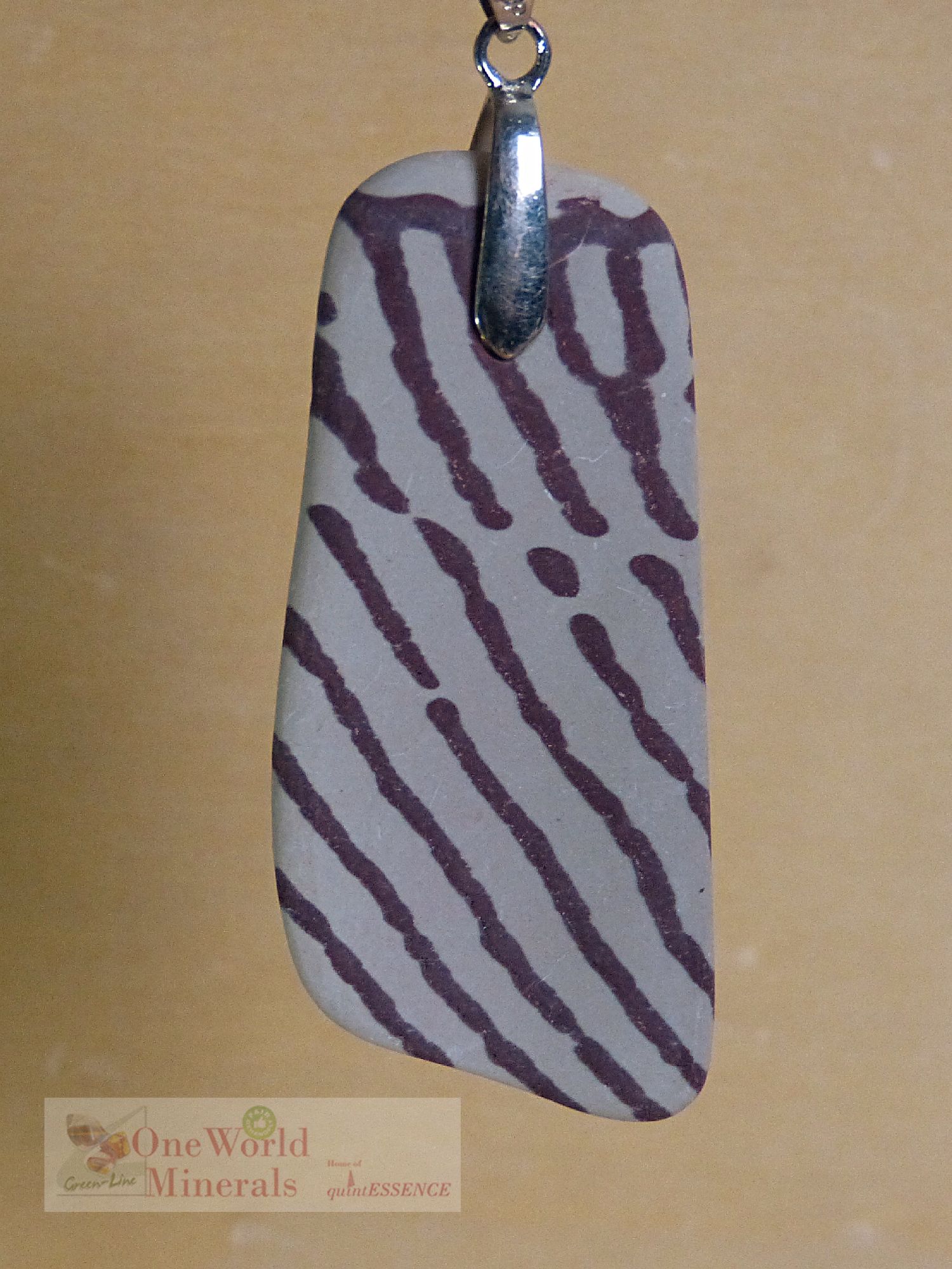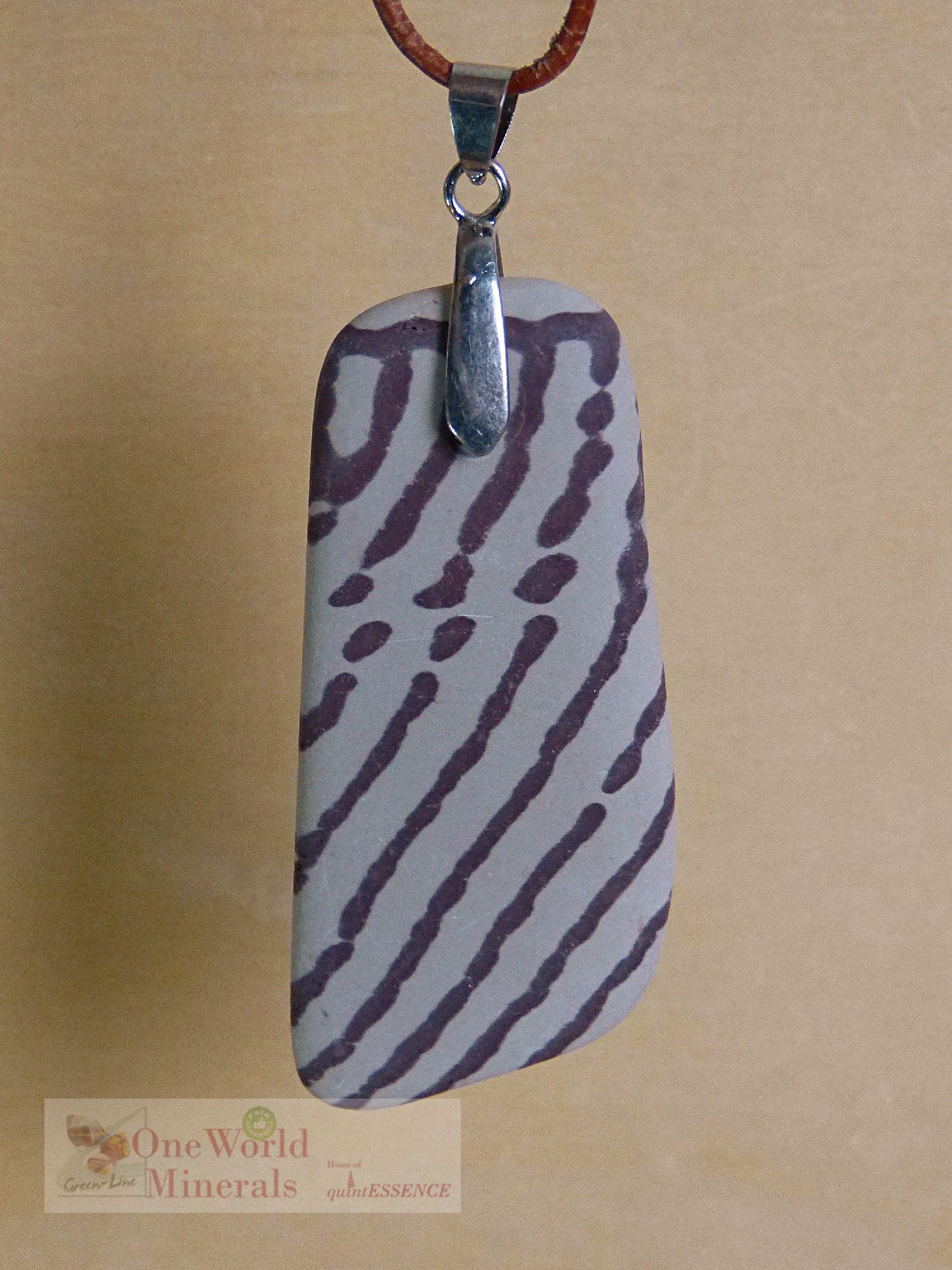 Flacher Zebrarock Anhänger (Australien), frontgebohrt, mit Silberclip.