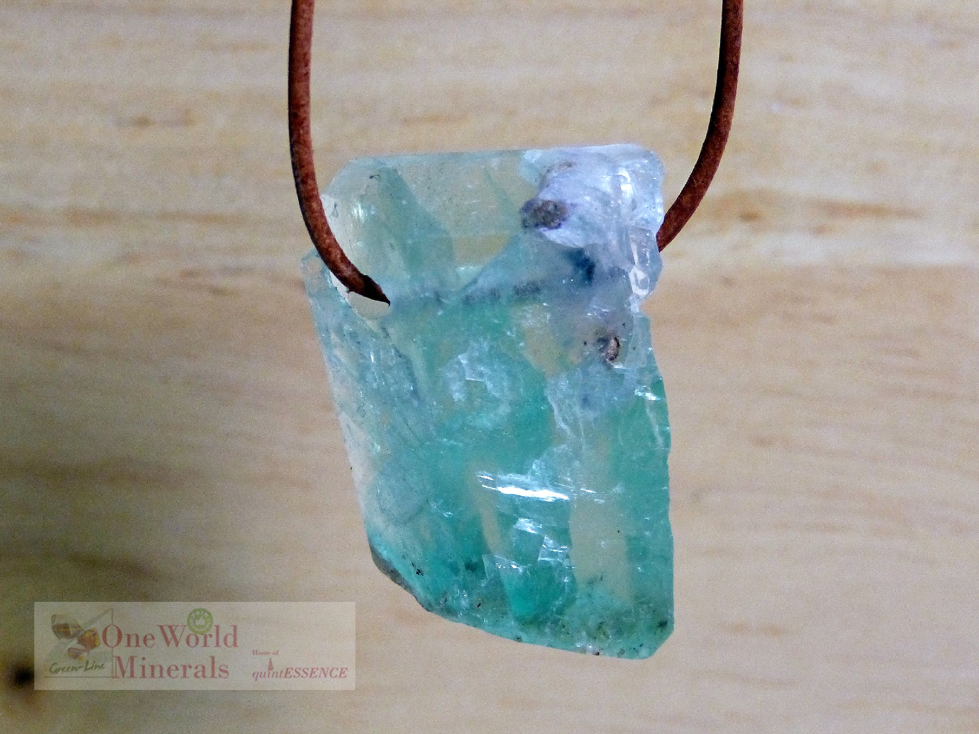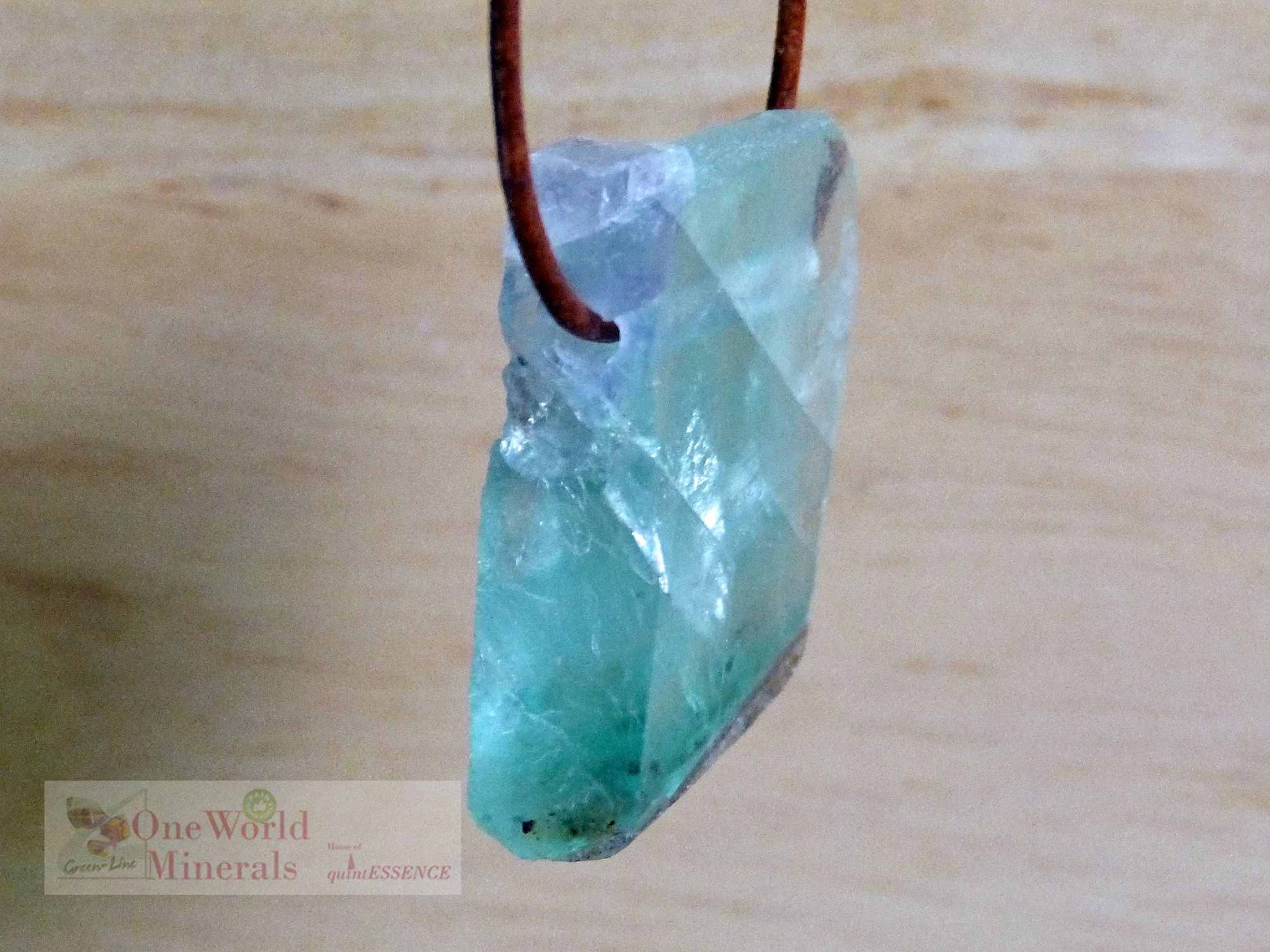 Grüner, transparenter Fluorit Anhänger, hergestellt aus einem Fluorit Bruchstück.
